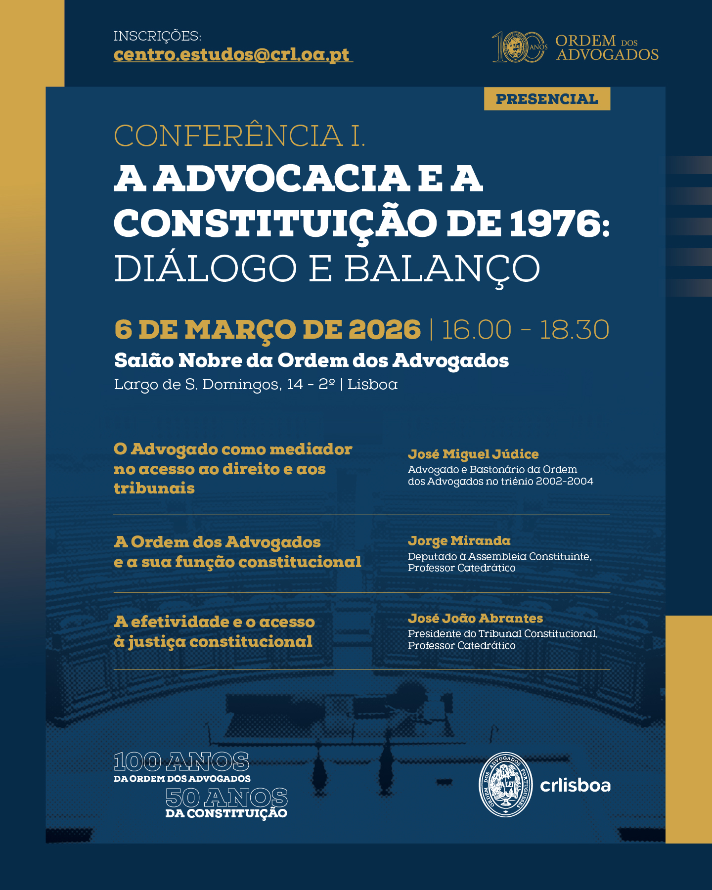 No âmbito das comemorações dos 50 Anos da Constituição da República Portuguesa e dos 100 Anos da Ordem dos Advogados, o Conselho Regional de Lisboa organiza um Ciclo de Conferências.